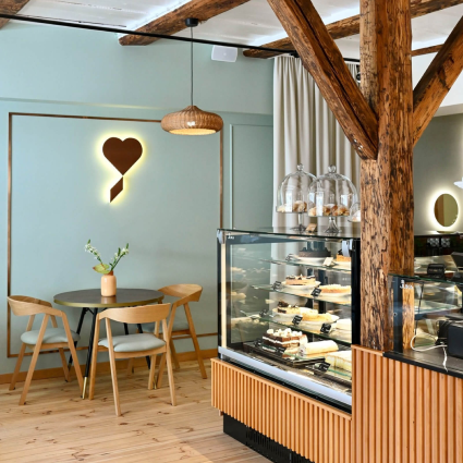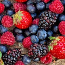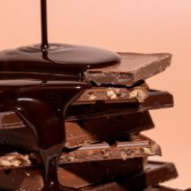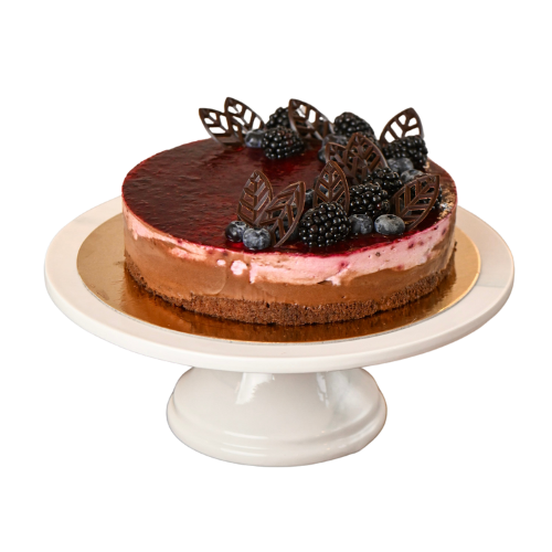 Połączenie musu z owoców leśnych z warstwą czekolady mlecznej na kakaowym biszkopcie.