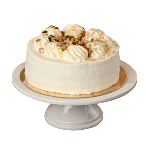 Klasyczny biszkopt jasny/kakaowy przełożony bitą śmietaną z dodatkiem bakalii.