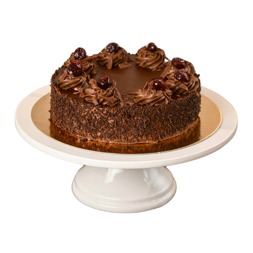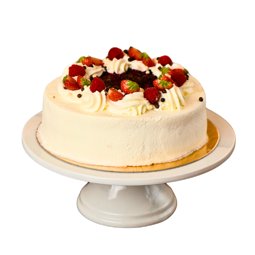 Klasyczny biszkopt jasny/kakaowy przełożony bitą śmietaną z wiśnią w żelu w środku.