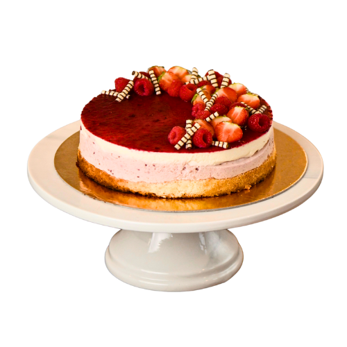 Jasny biszkopt nasączony, mus z malin połączony z musem na bazie serka mascarpone i śmietany oraz galaretka z malinami w środku.